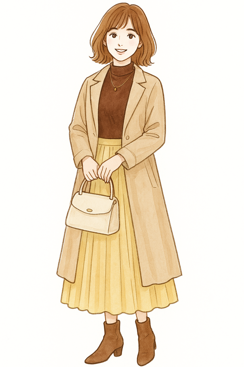 モカブラウンのニットに、淡いイエローのスカートやストールを合わせて。