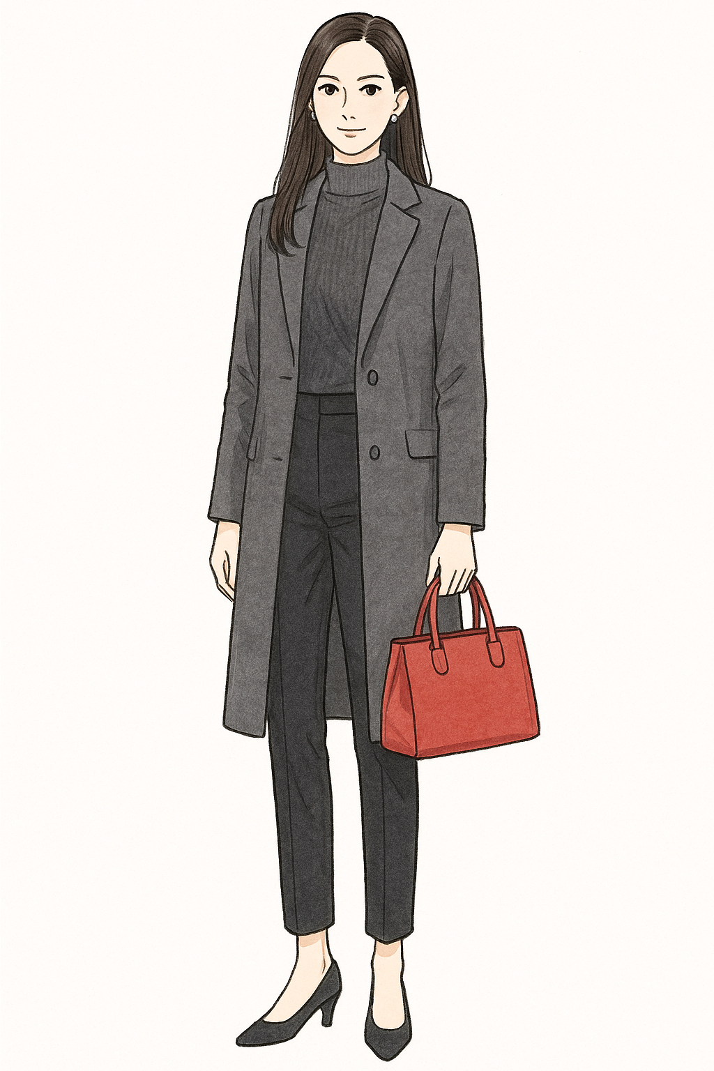 グレーのコートに赤いバッグを差し色に。