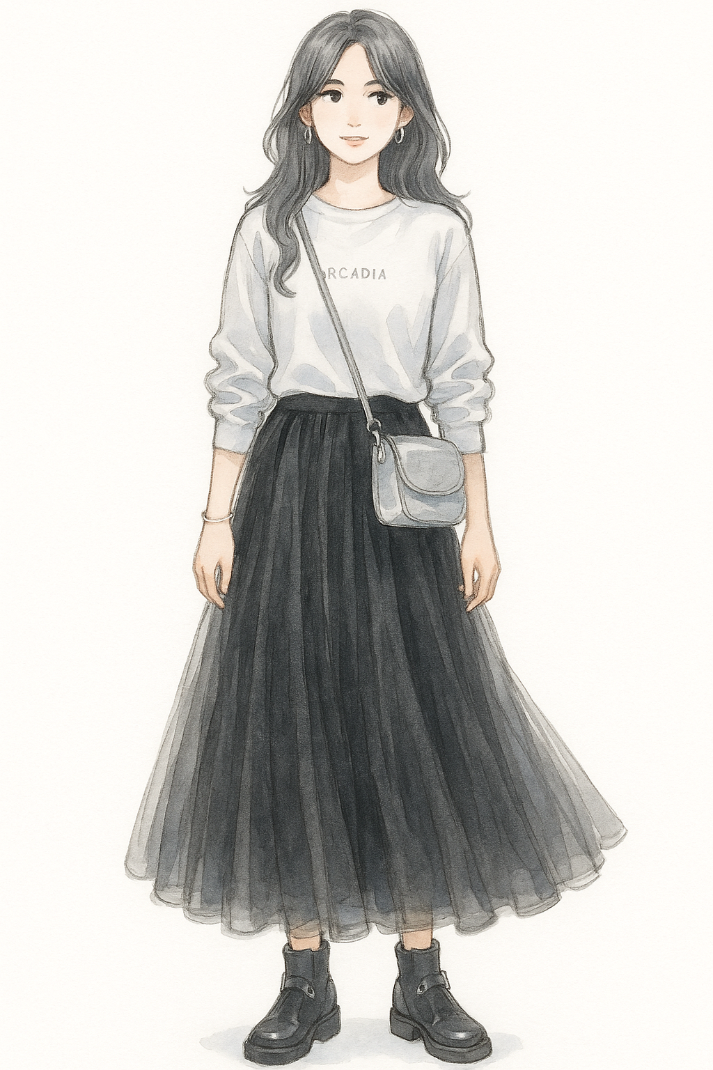 白黒コーデにシルバーのバッグを一点プラス。
