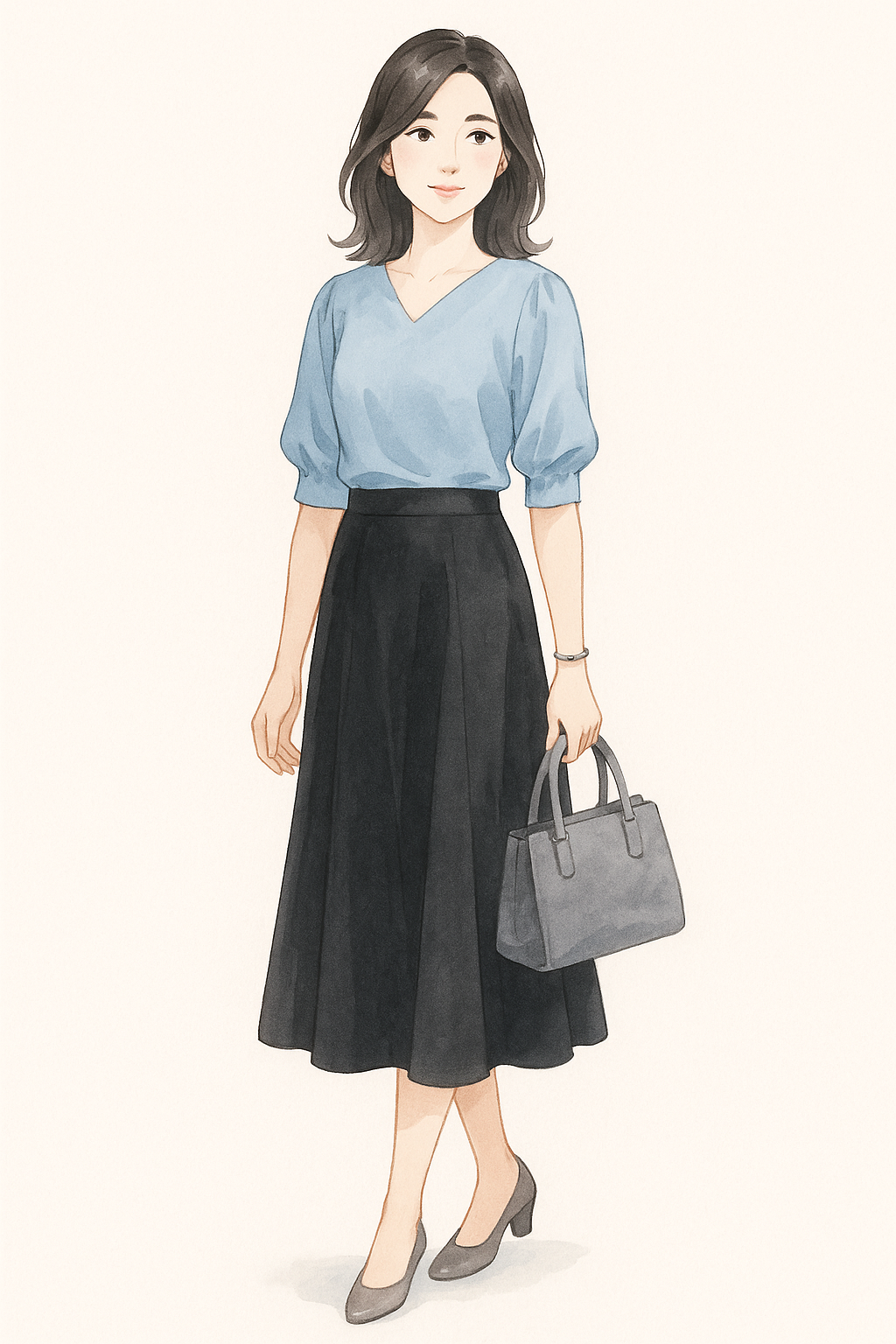黒のスカートにアイスブルーのブラウスを。