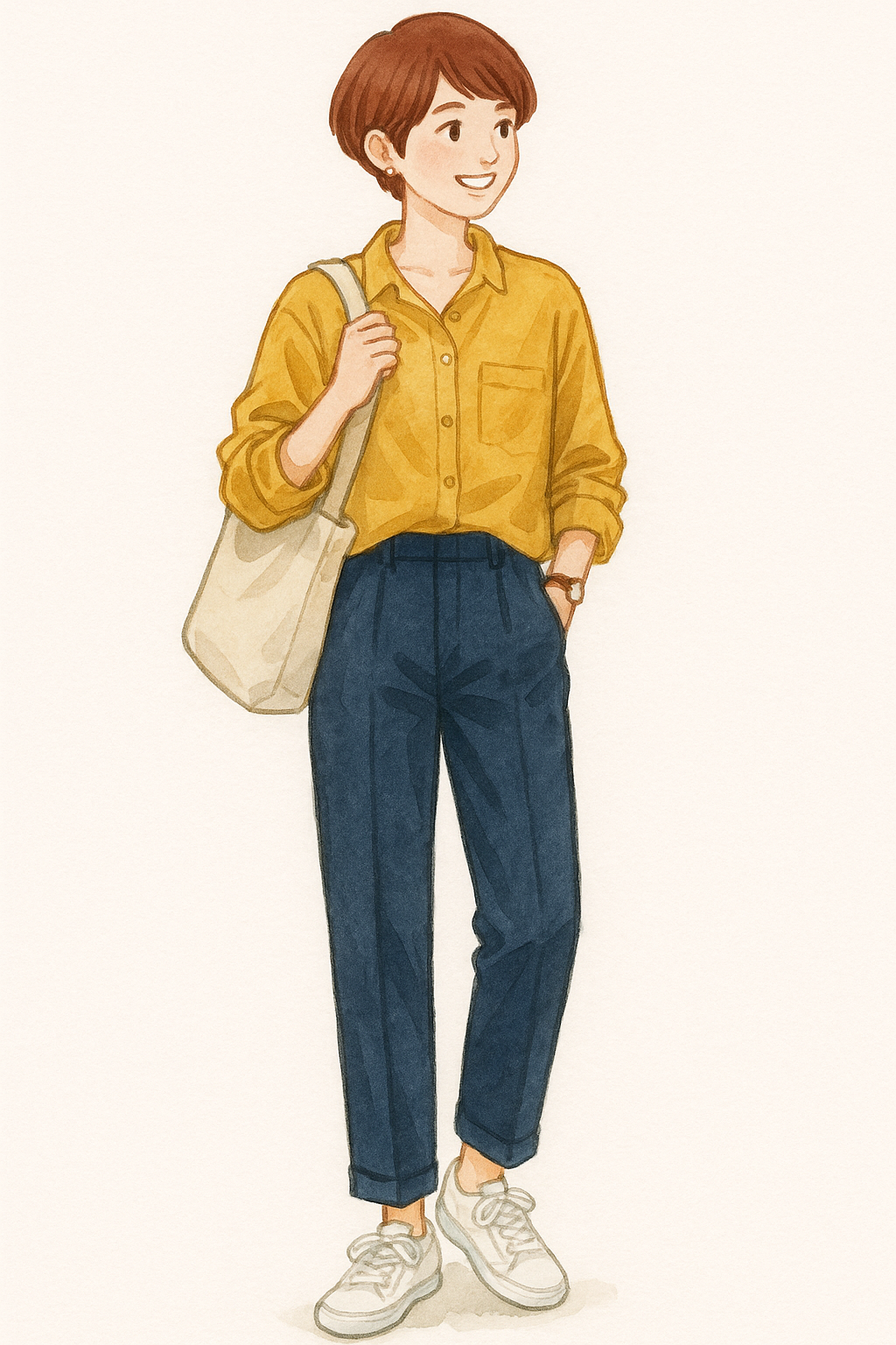 マスタードのシャにネイビーのボトム。